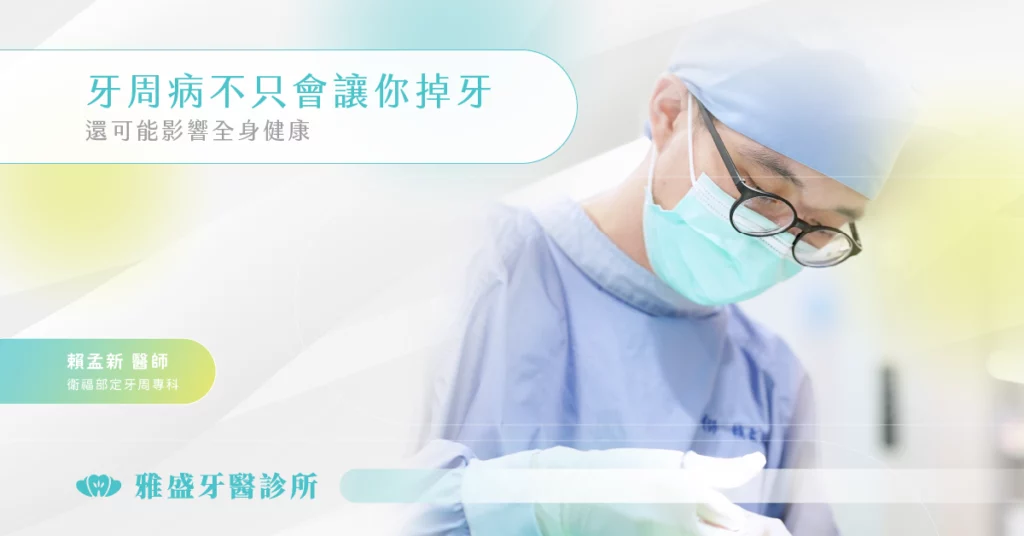 牙周病不只是口腔問題,它的影響可能遍及全身,牽涉到心血管、代謝與免疫健康。台中雅盛牙醫,透過專業的牙周專科醫師,根據不同階段制定牙周治療與維護計畫,能幫助患者改善牙齦發炎、重建牙齒穩定,也降低全身健康的潛在風險。長期維持良好的口腔清潔與定期檢查,不僅能留住牙齒,也是再為整體健康加一道防線!台中雅盛牙醫關心您。